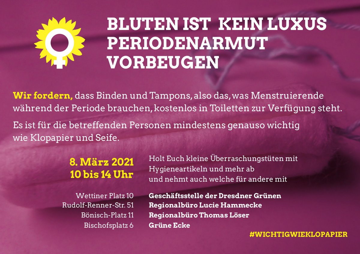 Bündnis 90/Die Grünen, SPD und Linke in Dresden fordern, dass Binden und Tampons, also das, was Menstruierende während der Periode brauchen, kostenlos in Toiletten zur Verfügung steht. Es ist für die betreffenden Personen mindestens genauso wichtig wie Klopapier und Seife. Dresden könnte damit ein gutes Beispiel für andere Städte und Kommunen und auch für Landeseinrichtungen geben und den Vorreitern Schottland, Frankreich und Neuseeland folgen.