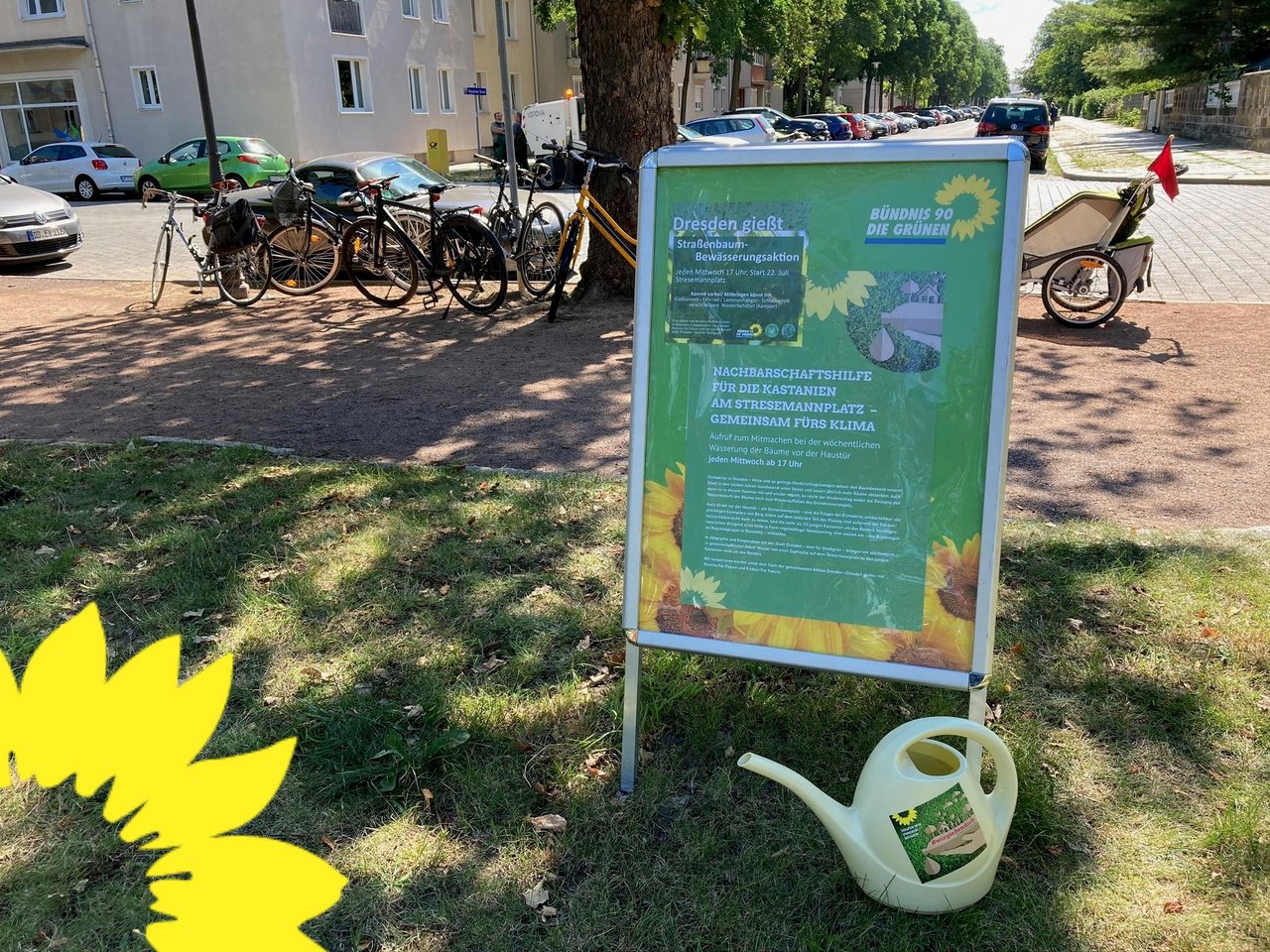 Am 22. Juli starteten die Blasewitzer Grünen ihr Gießprojekt für die Kastanien am Stresemannplatz. Eine Aktion, die in Kooperation mit "Parents For Future/Fridays For Future" im Rahmen des Projektes "Dresden gießt" stattfindet.