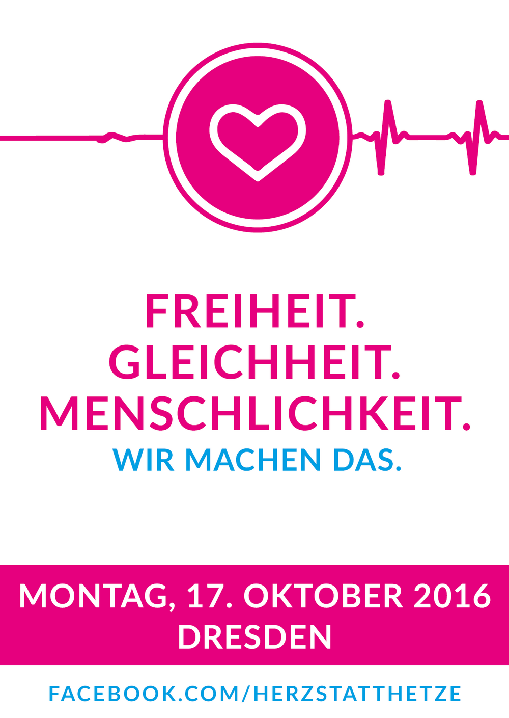 Die Vorstände von Kreisverband und der Stadtratsfraktion von BÜNDNIS 90/DIE GRÜNEN rufen alle Dresdnerinnen und Dresdner dazu auf sich am 17. Oktober dem Bündnis „Herz statt Hetzte“ anzuschließen und unter dem Motto „Freiheit. Gleichheit. Menschlichkeit.“ auf die Straße zu gehen. Susanne Krause, Sprecherin des Dresdner Kreisverbandes von BÜNDNIS 90/DIE GRÜNEN: „Nach den Ereignissen der letzten Wochen wird es Zeit der Welt ein anderes Dresden zu zeigen. Wir wollen ein offenes, ein buntes und vielfältiges Dresden, wo sich Menschen unabhängig von Religion, Herkunft oder Aussehen sicher und zu Hause fühlen können. Es ist an uns, zu zeigen, dass die Mehrheit der Dresdnerinnen und Dresdner Rassismus und Fremdenfeindlichkeit nicht akzeptiert und Hassparolen keine Gesprächsgrundlage sind. Wir bedanken uns auch ganz ausdrücklich bei den Menschen wie den AkteurInnen von Herz statt und Hetze und Dresden Nazifrei, die sich seit Jahren unermüdlich in Dresden für Menschenwürde und eine offene Gesellschaft engagieren.“ Thomas Löser, Fraktionsvorsitzender von BÜNDNIS 90/DIE GRÜNEN: „Wir müssen uns als Dresdnerinnen und Dresdner klar gegen solche Pöbeleien und Hassparolen wie die vom 3. Oktober in Dresden, aber auch von Pegida seit Monaten verbreitet, positionieren. Wir sind in der Pflicht zu zeigen, dass es sich bei diesen Menschen um eine Minderheit handelt, denen wir nicht die Deutungshoheit über unsere Stadt überlassen. Das sind wir den Grundwerten unserer Gesellschaft, aber auch allem Mitmenschen, die von dieser Minderheit bedroht werden, schuldig. Wir freuen uns sehr, dass der Oberbürgermeister deutliche Worte gefunden hat und zum Handeln aufruft. Wir laden ihn ein mit uns gemeinsam nicht nur an seinem Bürgerfest, sondern auch an der Demonstration von Herz statt Hetze teilzunehmen und auch das Engagement der vielen Dresdnerinnen und Dresdner zu würdigen, die sich schon seit langem Hass und Hetze in ihrer Stadt entgegenstellen.“