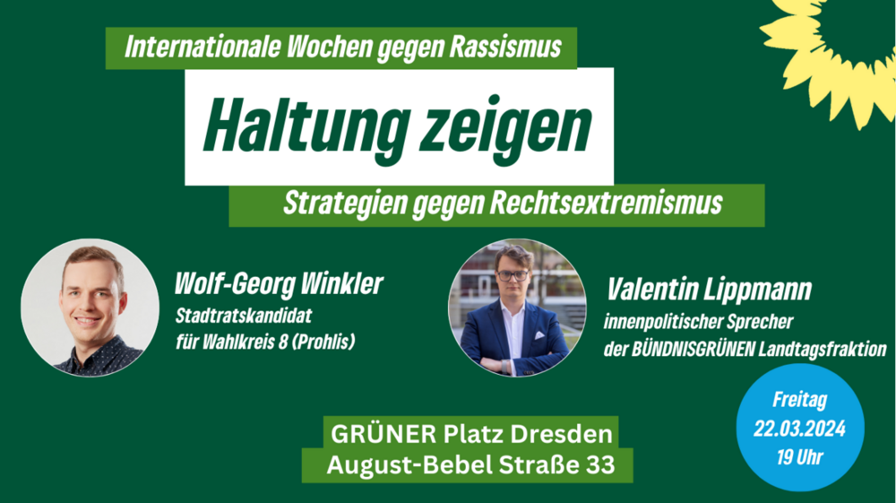 Darüber wollen Wolf-Georg Winkler - Stadtratskandidat für Prohlis, Strehlen und den Dresdner Südosten – sowie Valentin Lippmann – innenpolitischer Sprecher der grünen Landtagsfraktion – am Freitag, 22.03.2024, um 19 Uhr im Grünen Büro am Wasaplatz, August-Bebel-Str. 33, 01219 Dresden diskutieren.