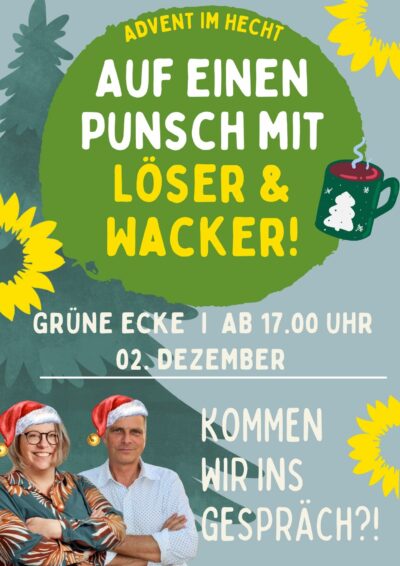 Und ab 17 Uhr gibt es „Auf eine Punsch mit Löser und Wacker“. Komm ins Gespräch mit unserem Landtagsabgeordneten Thomas Löser unserer Stadträtin Ulla Wacker.