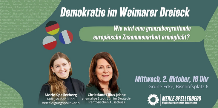 Wir laden grüne und nicht-grüne politisch interessierte und engagierte Dresdner:innen zum Austausch und es wird, neben der politischen Einordnung auch darum gehen offen mit dem Publikum zu diskutieren, was die Zusammenarbeit der drei Länder auf lokaler Ebene bedeutet und wie wir das Weimarer Dreieck vor Ort leben. Weitere Dimensionen der Diskussion: Wie kann Demokratie im Weimarer Dreieck außenpolitisch gestaltet und wehrhaft werden? Wie wird eine grenzübergreifende europäische Zusammenarbeit ermöglicht? Wie kann das Weimarer Dreieck als Gesprächs- und Konsultationsforum die europäische Integration stärken?