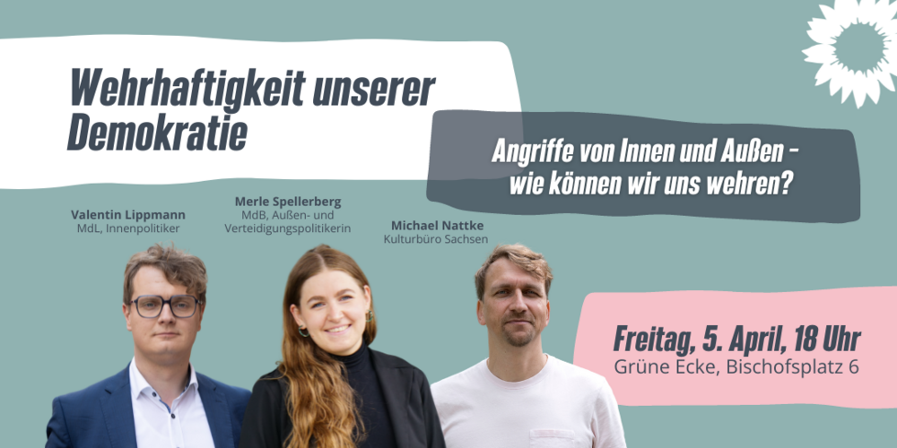 Was wir gegen diese Angriffe tun können, in Sachsen, im Bund und global- darüber möchte ich, Merle Spellerberg MdB auf meiner Diskussionsveranstaltung „Wie wehrhaft ist unsere Demokratie?“ mit Valentin Lippmann MdL und Michael Nattke vom Kulturbüro diskutieren. Wir freuen uns auf euch!