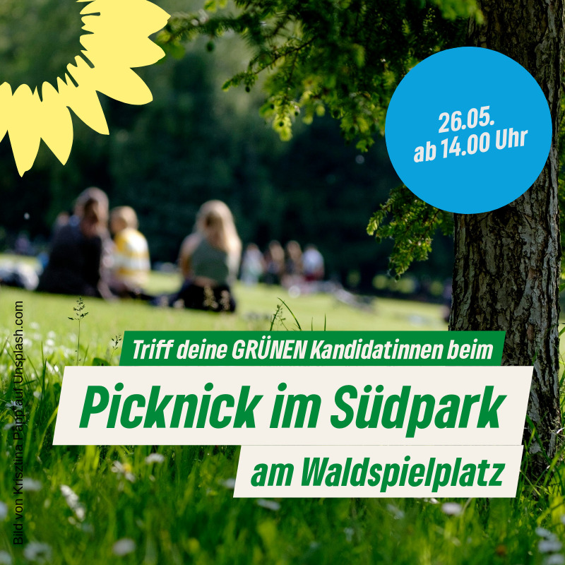 Dies alles und noch viel mehr könnt ihr beim GRÜNEN Picknick am Waldspielplatz im Südpark am 26.05.2024 (Sonntag) ab 14.00 Uhr erleben. Angelehnt an das Picknick der AG FEM im letzten Jahr wollen wir uns treffen und von unseren Wahlkampferfahrungen berichten.