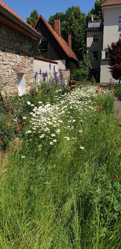 Alle Blumen werden - sofern kein Regen fällt - ausschießlich per Hand mit Wasser aus den Regentonnen versorgt und mit Kompost vom hauseigenen Komposthaufen gedüngt. Auf Schädlingsbekämpfung wird vollständig verzichtet.