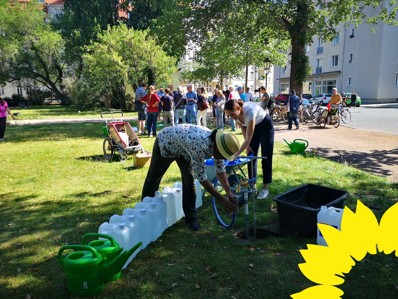 Gründet Gieß- und Baumpatenschaften und kümmert Euch gemeinsam um einen Baum. Eine Plattform, über die sich Gießgruppen finden und vernetzen können, ist die Initiative Dresden gießt! Dort gibt es auch Hilfestellung und viele praktische Informationen.