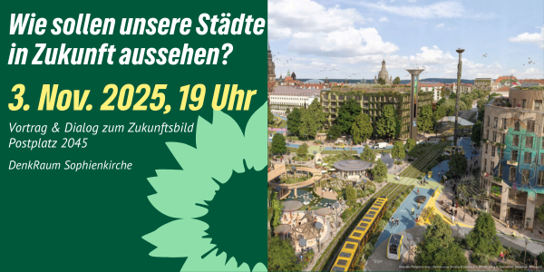 Am 3. November 2025 um 19 Uhr lädt die AG Stadtentwicklung von BÜNDNIS 90/DIE GRÜNEN Dresden zu einer Veranstaltung im DenkRaum Sophienkirche ein. Im Mittelpunkt steht das „Zukunftsbild Postplatz 2045“. Drei Impulsvorträge geben Einblicke in die Vision und in das Konzept der Schwammstadt. Anschließend sind alle Teilnehmenden eingeladen, über nachhaltige Stadtentwicklung zu diskutieren und eigene Ideen einzubringen.